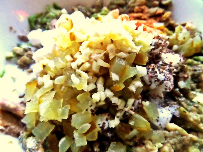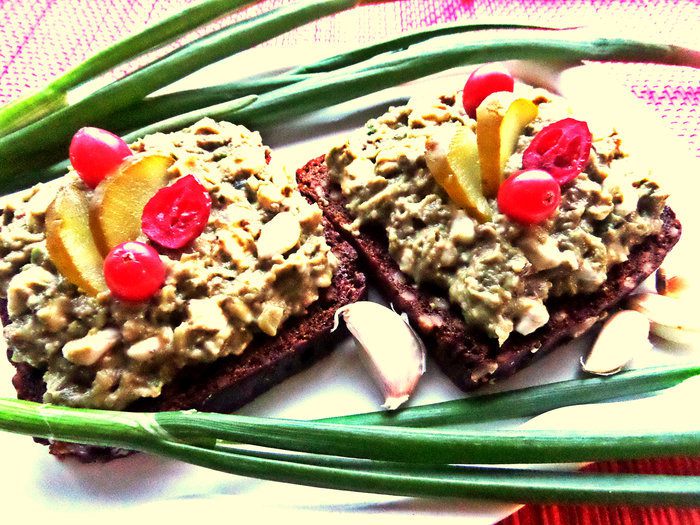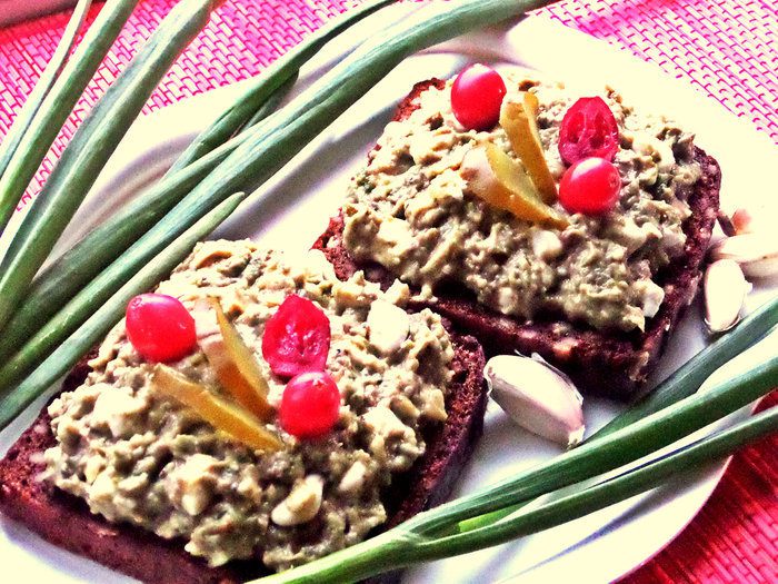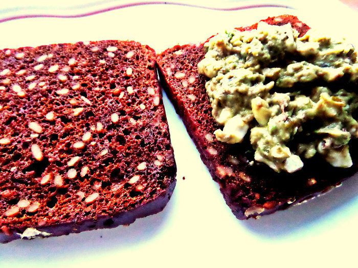 Распределяем намазку на подсушенный в тостере хлеб (это можно сделать прямо на пикнике). Хлеб у меня ржаной с семечками,просто из тостера с маслицем-уже вкусно :)