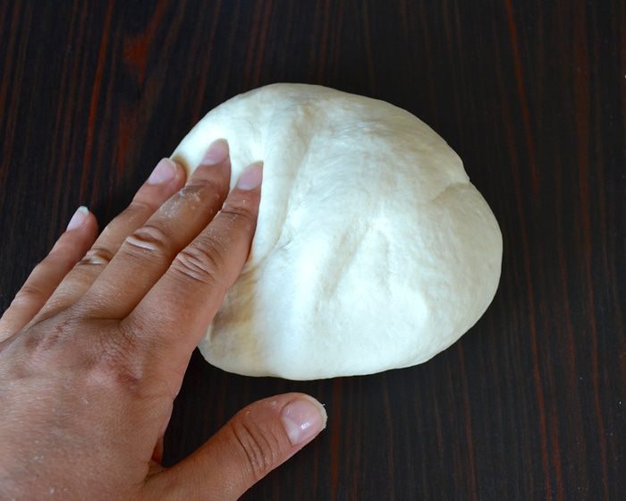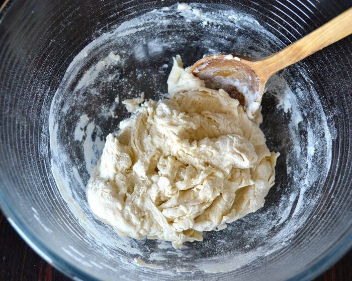 Выложите тесто на слегка присыпанную мукой рабочую поверхность и вымесите его минут 7 (руки можно слегка смазать оливковым маслом, чтобы не подсыпать дополнительно муки).