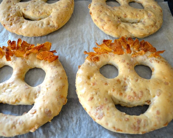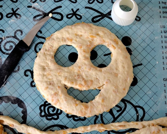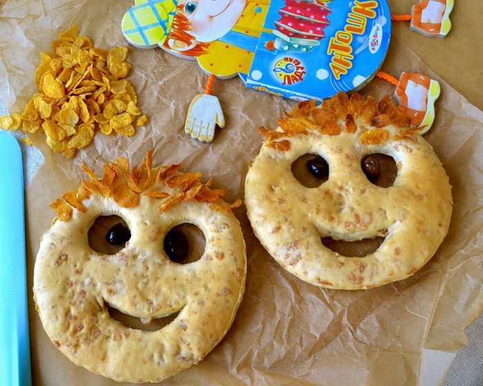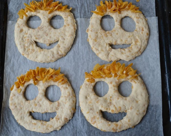 Повторите то же самое со всеми 4 рожицами. Смажьте их слегка оливковым маслом и поставьте в разогретую до 190 градусов духовку на 20 минут (до золотистого цвета).