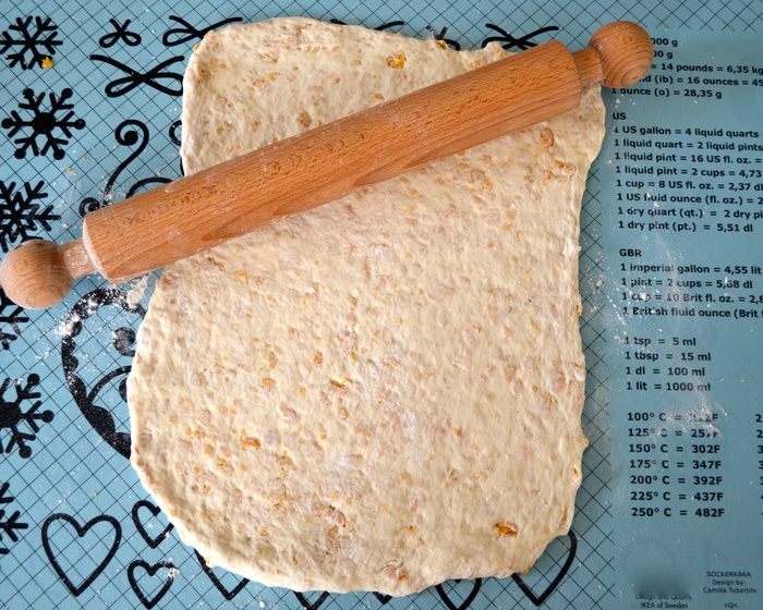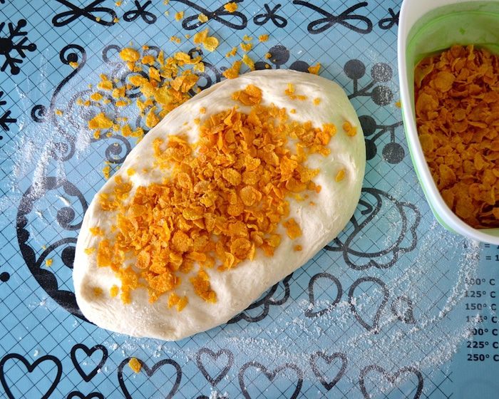 Выложите подошедшее тесто на рабочую поверхность, расплющите слегка и распределите 50-60 г кукурузных хлопьев (несладких). Вымесите еще немного тесто, позволяя хлопьям распределиться по всему тесту.