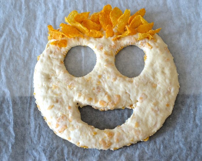 Перенесите на противень застеленный пекарской бумагой и сверху воткните оставшиеся кукурузные хлопья, наподобие "шевелюры"... В этом вам могут помочь детки! :)