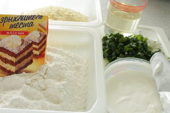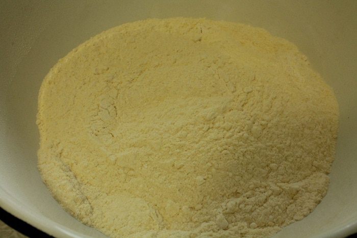 Смешать кукурузную и пшеничную муку с разрыхлителем, просеять.