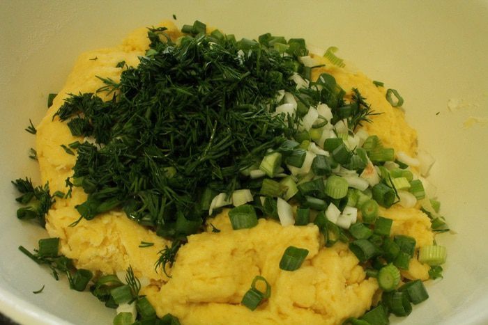 Соединить мучную и яичную смесь, получается довольно густое тесто. Добавить зелень, перемешать ложкой.