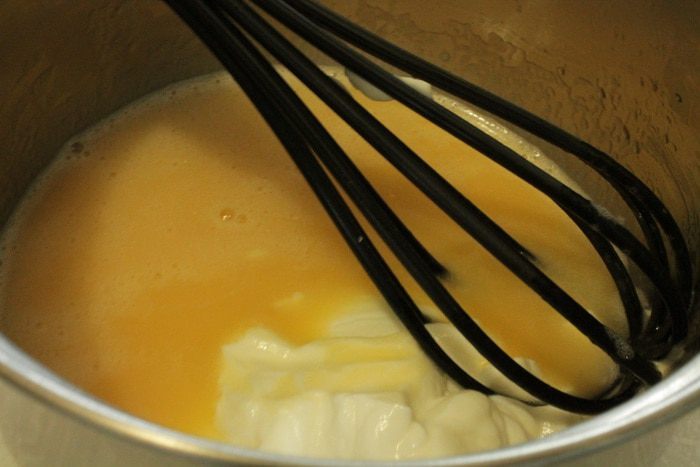 Яйца слегка взбить с солью с помощью венчика, добавить растительное масло, снова взбить венчиком, добавить йогурт, перемешать.