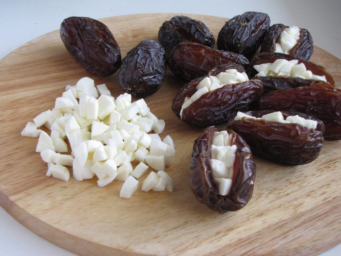 Финики можно также фаршировать половинками грецкого ореха.