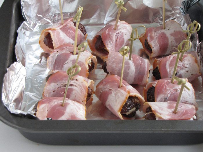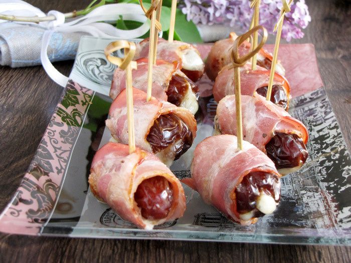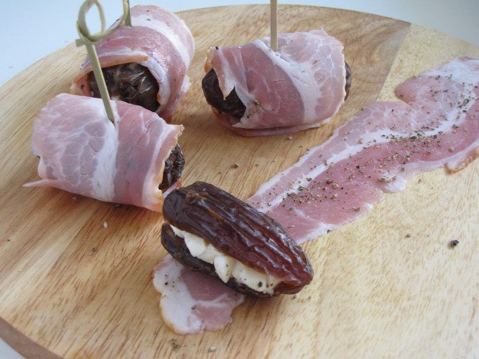 Полоски бекона поперчить по вкусу и завернуть в них финики. Сколоть шпажкой или зубочисткой.