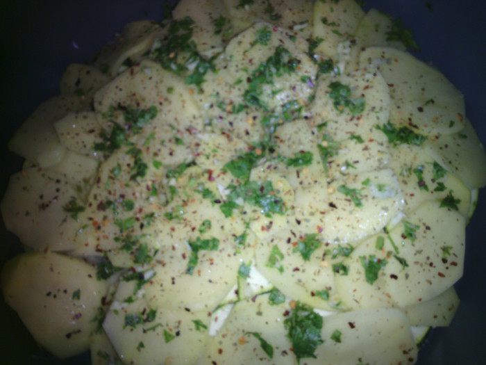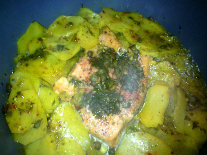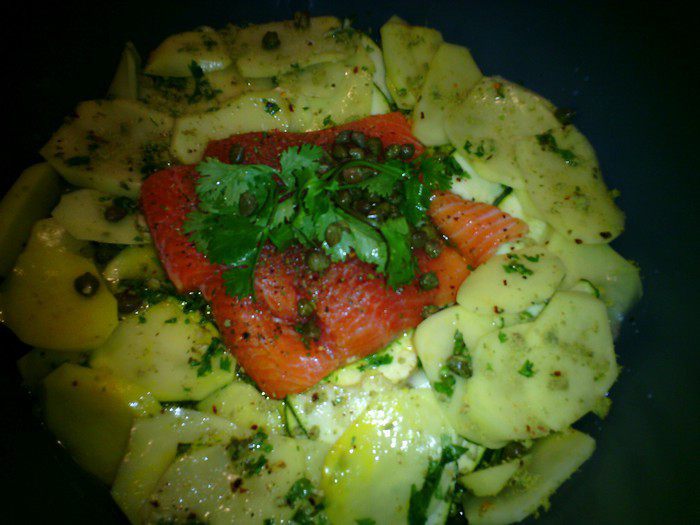 Также нарезать картофель, выложить на цукаты, мелко нарезать, чеснок и кориандр. По середине лопаткой сделать отверстие и положить форель.