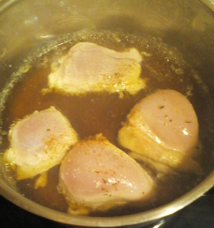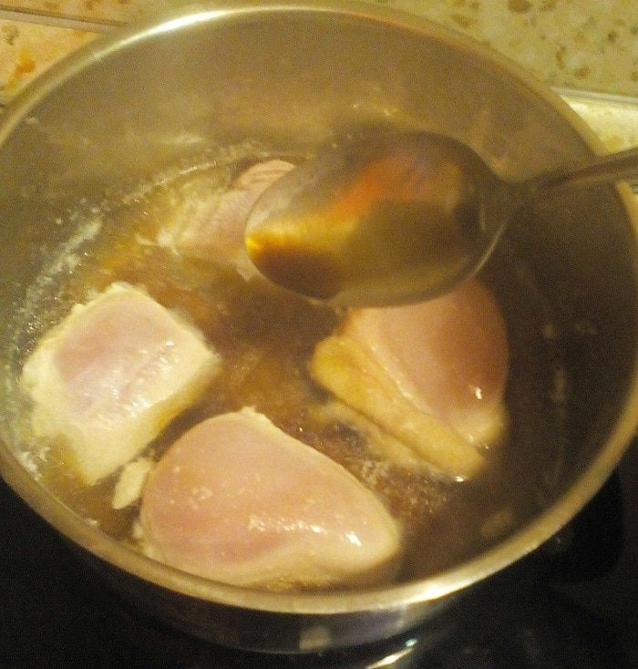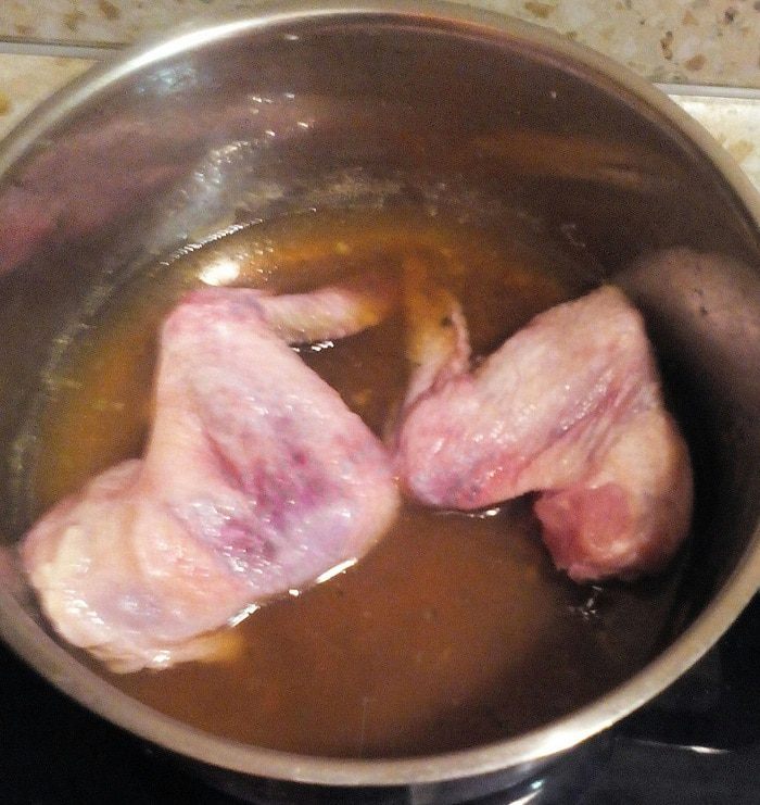 Бульон, если он у вас еще не "оттаял" после холодильника, подогреть в микроволновке, смешать со сметаной. Теперь, я думаю, вы поняли, зачем мы варили крылышки: в их косточках естественный желатин, который при варке, выделяется в бульон, и затем густеет. Думаю, можно сразу сварить вместе крылышки с кусочками грудки, если у кого получится, пишите!