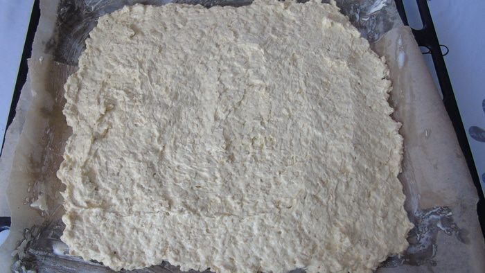 Пергамент смажьте сливочным маслом и выложите тесто, разровняйте ножом.