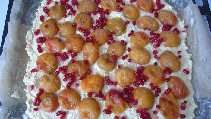 Сверху распределите абрикосы и смородину.