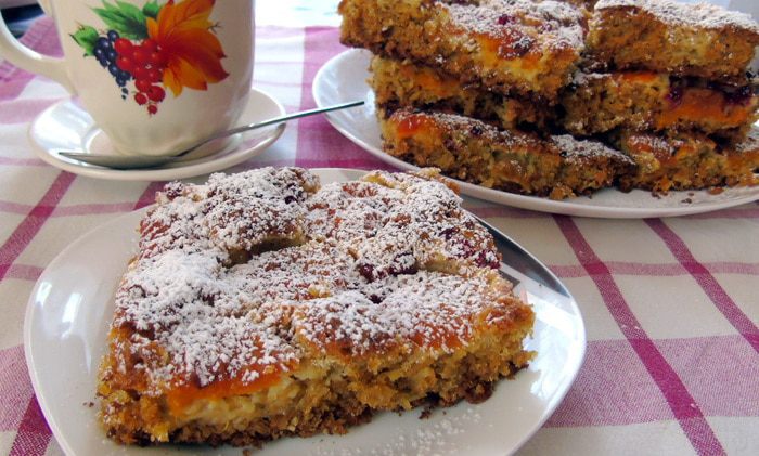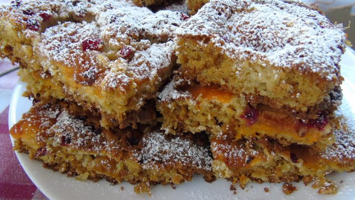 Выпекайте в разогретой до 200С духовке до золотистой корочки. После слегка остудите и разрежьте смоченным в холодной воде ножом. Как полностью остынет присыпьте сахарной пудрой.