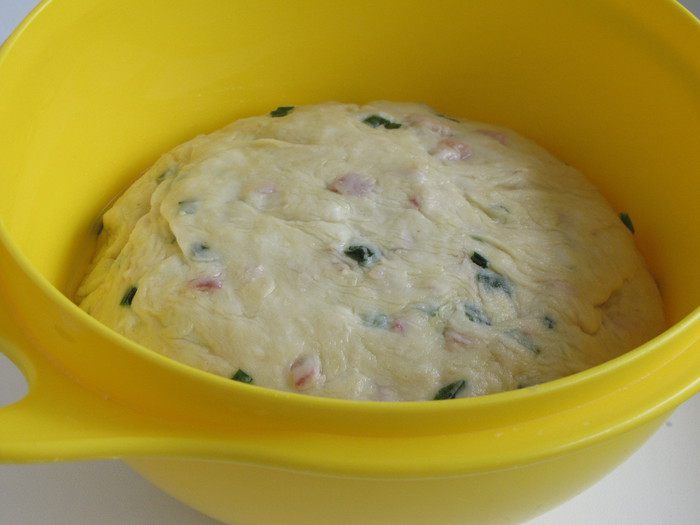 Скатать тесто в шар, смазать оливковым маслом. Накрыть миску пищевой пленкой и оставить тесто в теплом месте на 1 час. Обмять тесто и оставить для еще одного подхода, 45 минут.