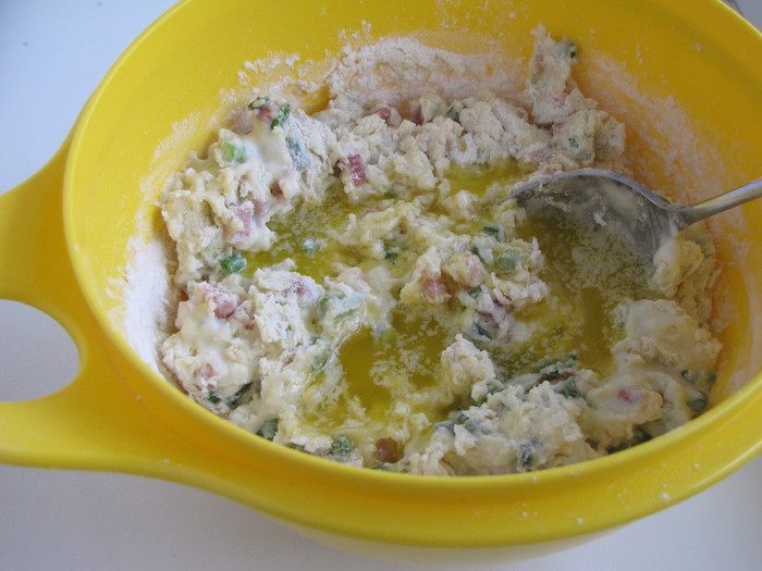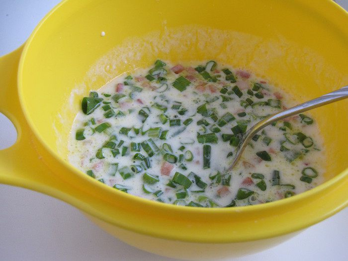 Добавить ветчину и зеленый лук.
