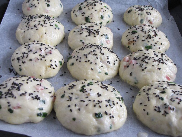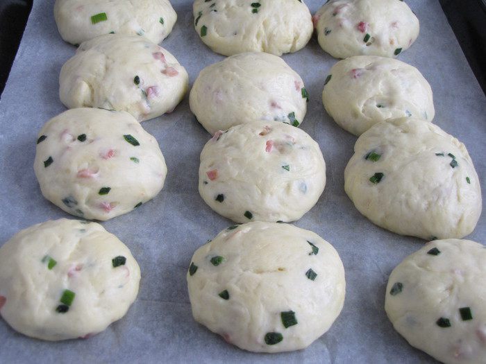 Разделить тесто на кусочки размером с яйцо и скатать из них шарики. Застелить противень бумагой для выпечка, смазанной маслом. Положить булочки,накрыть полотенцем и оставить на 30 минут.