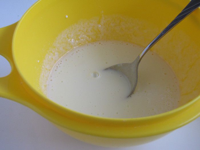 В несколько приемов всыпать муку, хорошо размешивая. Влить растопленное сливочное масло и замесить тесто.