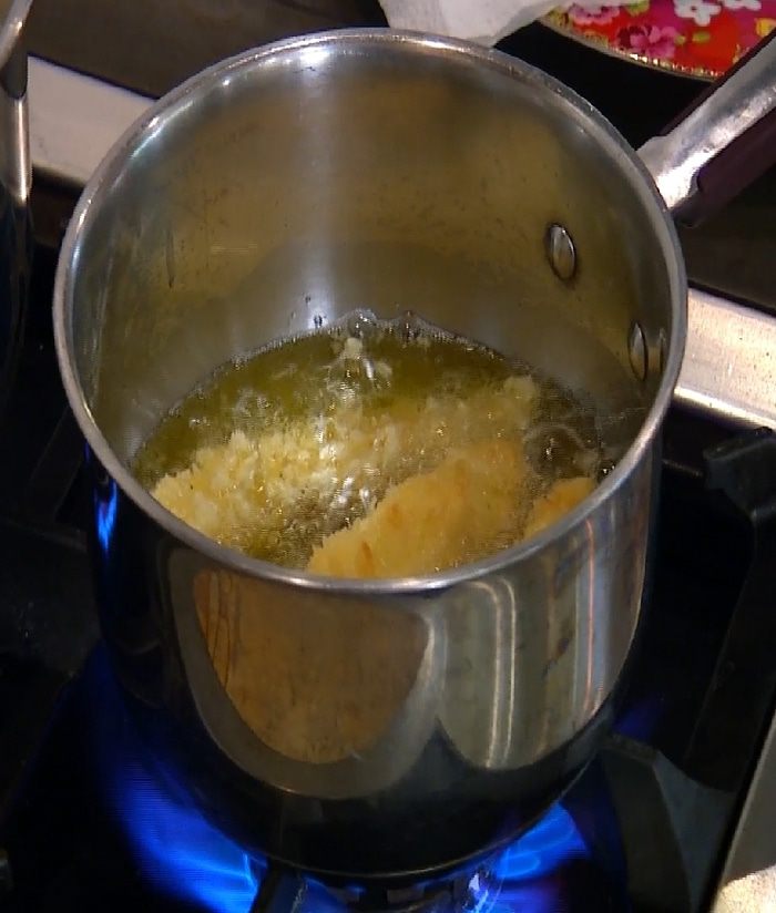 В небольшую кастрюлю налить оливковое масло слоем в два сантиметра, разогреть его и жарить рыбу до готовности.
