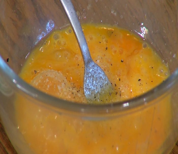 Яйца разбить, посолить, поперчить и перемешать вилкой.