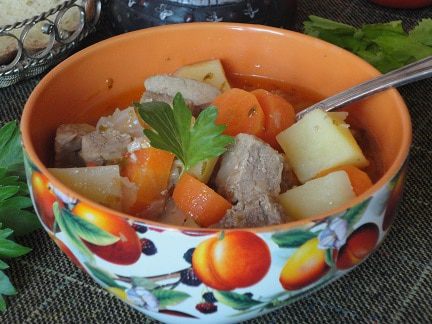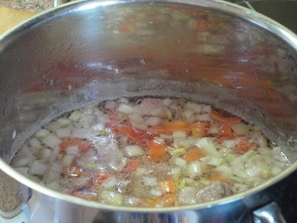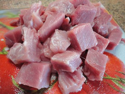 Лук и чеснок нарезать мелкими кубиками. В кастрюлю влить воду и выложить мясо. Довести до медленного кипения и собрать пенку. Затем добавить лук, чеснок, томатную пасту (я использовала свежий помидор, очистив его от кожицы и нарезав кубиками), растительное масло и винный уксус. Варить под крышкой на слабом огне 1 час (для свинины) или 1,5 часа (для говядины).