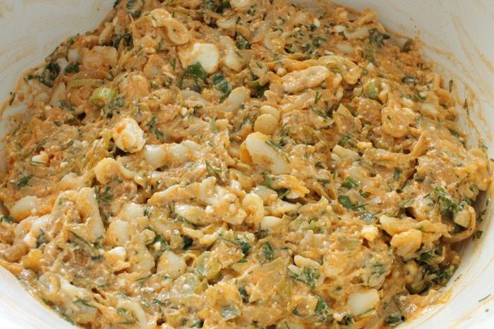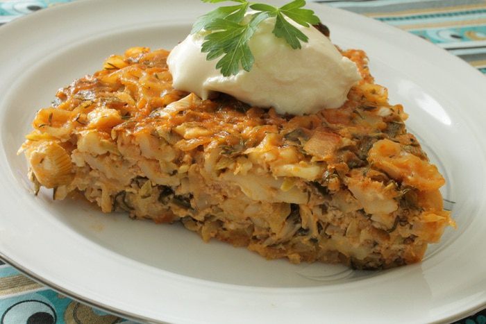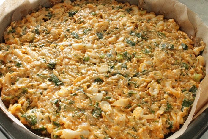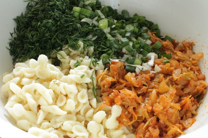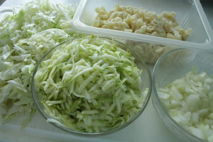 На растительном масле сначала обжарить лук до прозрачности, добавить томатную пасту, перемешать и прогреть 1-2 минуты. Добавить кабачок, обжаривать 5 минут, затем добавить капусту, обжаривать еще минут 10-15, что бы капуста слегка обмякла, остудить. Добавить к макаронам вместе с нарубленной зеленью укропа и лука.