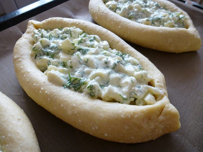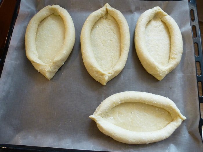 Готовые лодочки выкладываем на противень, застеленный пекарской бумагой.