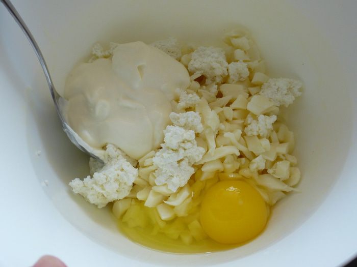 К сыру добавляем остальные ингредиенты. Все тщательно перемешиваем. Начинка готова.