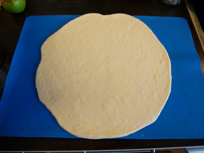 Тесто разделяем на 4 части. Каждую часть тонко раскатываем в круг диаметром примерно 28 см.