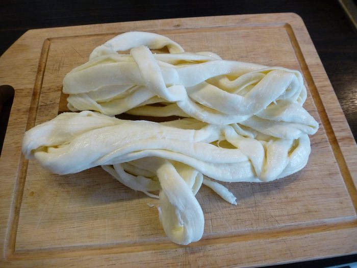 Для начинки я использовала вот такие нити сыра сулугуни. Нити нарезаем на небольшие кусочки. Если сыр куском, то его следует натереть на крупной терке.