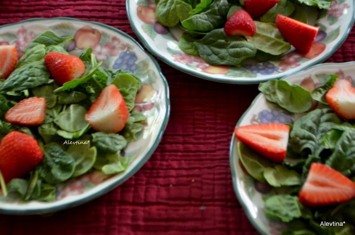Шпинат молодой промыть, хвостики убрать, разложить по тарелкам. Клубнику свежую разрезать на две части, крупную на 3-4 части. Положить поверх салата.
