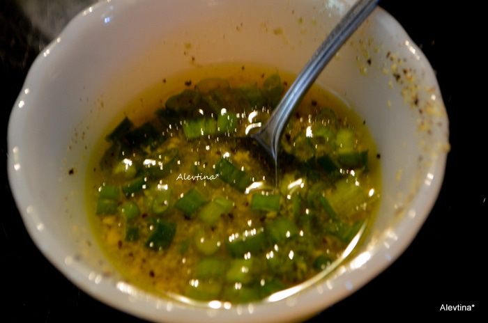 Приготовим заправку: смешать все в емкости, шнитт лук или зеленый перьеми - несколько перьев - порубить мелко.