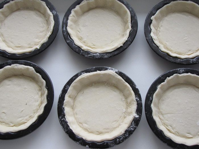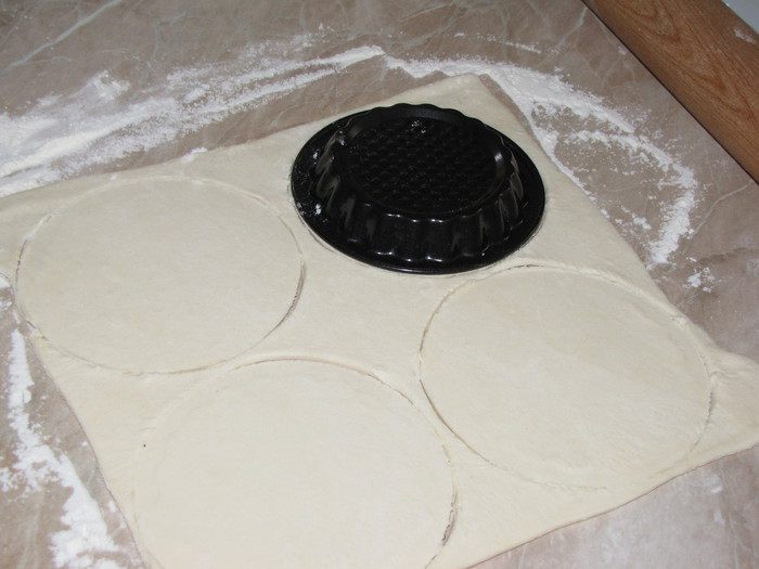 Аккуратно раскатать тесто, вырезать по размеру формочек круги. Формочки должны быть не высокими.