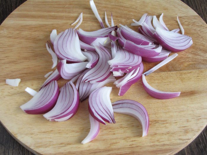 Луковицу очистить и разрезать на небольшие дольки.