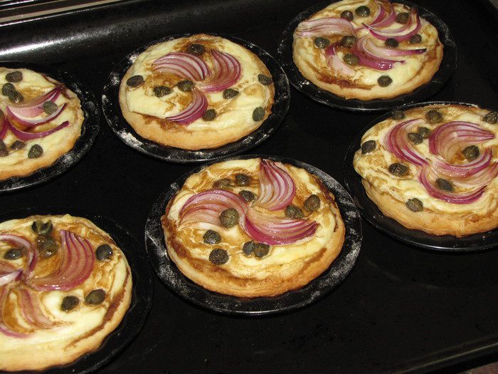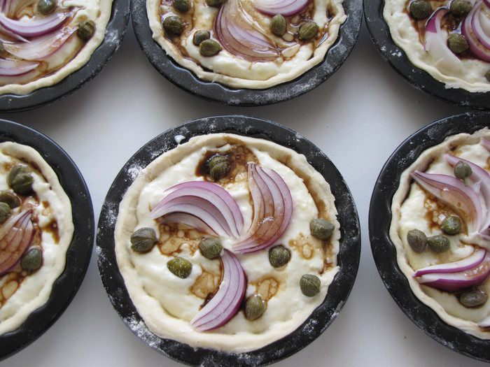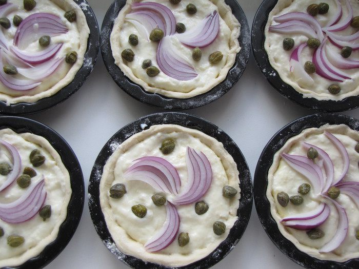 В каждую форму выложить 1 ст. л. сырно-яичного соуса (или больше, в зависимости от размера формочек), дольку лука и немного каперсов.
