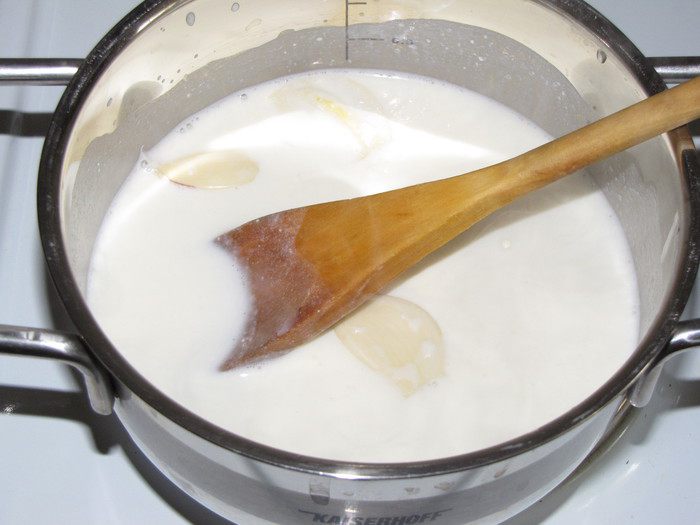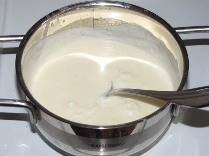 Влить желтковую массу в кастрюлю с молоком и, непрерывно помешивая, прогреть соус на медленном огне пока он не загустеет. Снять соус с огня, продолжая помешивать, чтобы он не зажарился и не превратился в омлет.