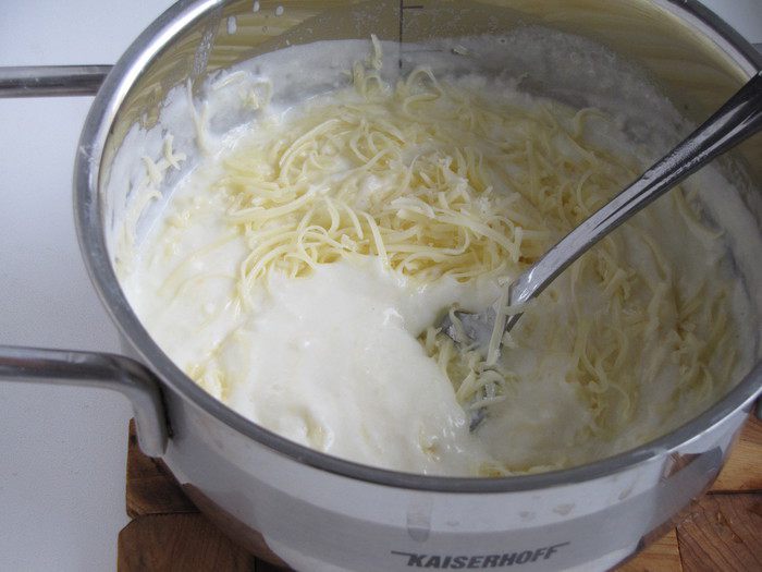 Сыр натереть на мелкой терке, добавить в соус и все тщательно перемешать.