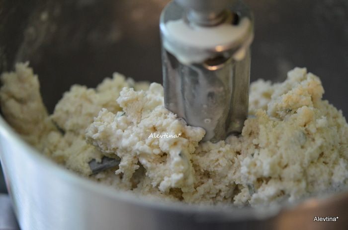 Смешать масло с мукой и прокрутить несколько раз, насадка весло. Добавить жирные сливки. Перемешать.