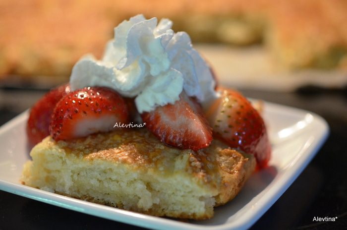 Подаем пиццу, посыпаем клубникой и поливаем слегка соком, сверху - взбитые сливки. Наслаждаемся вкусом. Детям понравится.