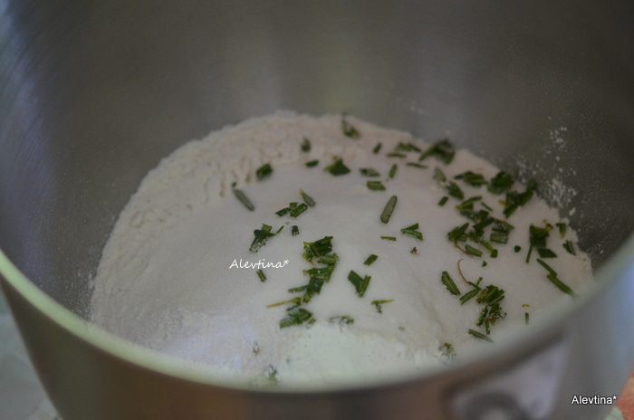 Разогреть духовку до 200 гр. В кухонном процессоре смешать муку, соль, разрыхлитель, сахар, розмарин свежий, порезанный.