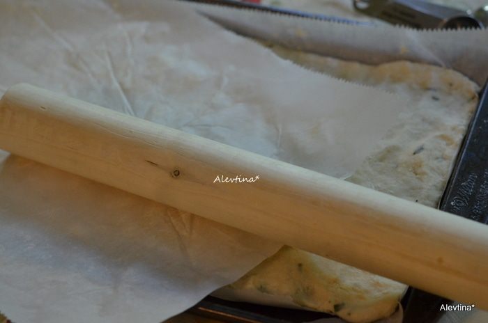Противень застелить бумагой для выпечки. Раскатать тесто по размеру противня прямоугольной формы.