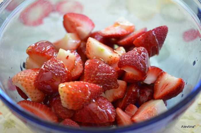 Клубнику свежую очистить от плодоножки и разрезать на 4 части крупную и на 2 - небольшую. Залить медом и поставить в сторону.