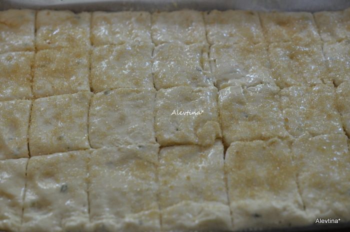 Разрезать или обозначить на небольшие квадратики, так чтобы нож не доходил до конца, смазать белком. Посыпать крупным сахаром. Поставить в горячую духовку на 25 мин.