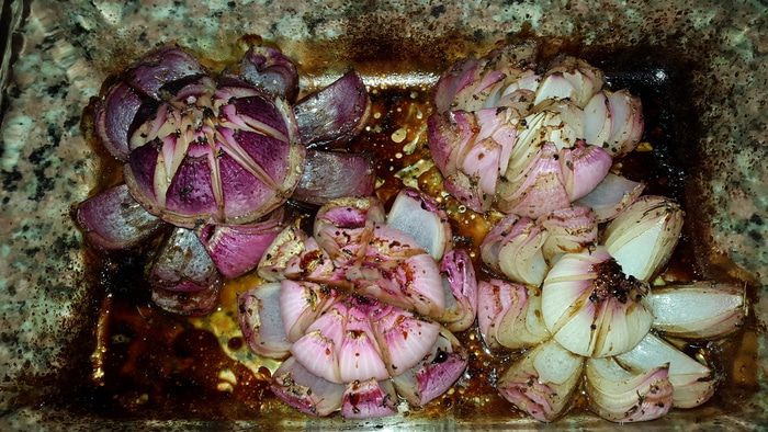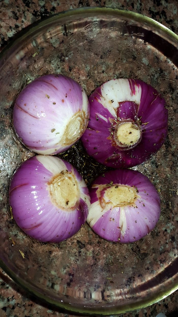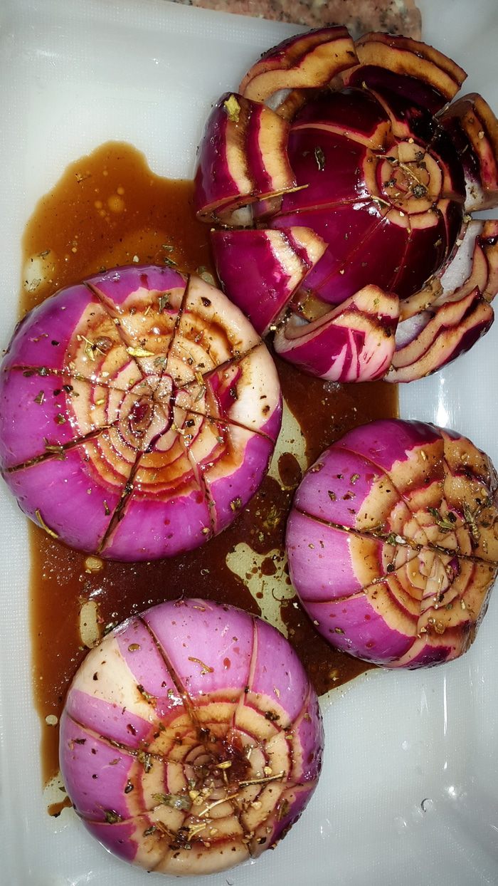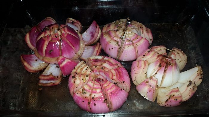 Выкладываем лук в форму для запекания на расстоянии друг от друга и поливаем соусом.