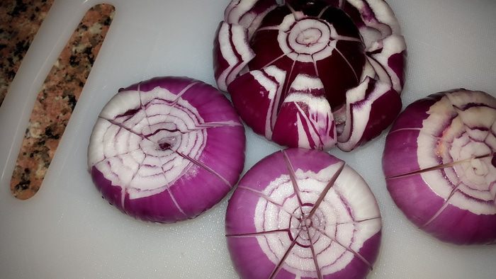 Лук чистим и надрезаем, но не до конца на 8 частей. Донышко тоже сильно не срезаем, чтобы лепестки не развалились.