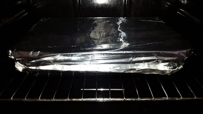 Накрываем фольгой и отправляем в духовку, включаем её на 220С и запекаем 25 минут.