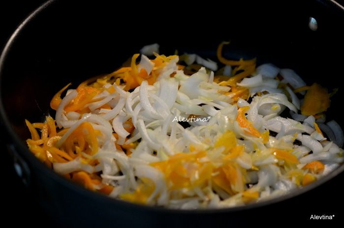 Обжарить на горячей сковороде или в жаровне на масле тонко порезанную луковицу и сладкий очищенный перец порезанный тонко, чеснок.
