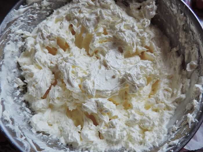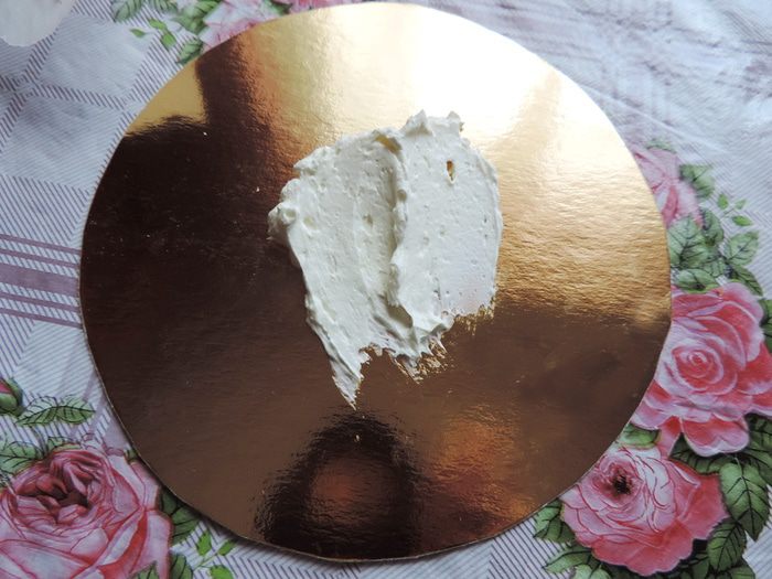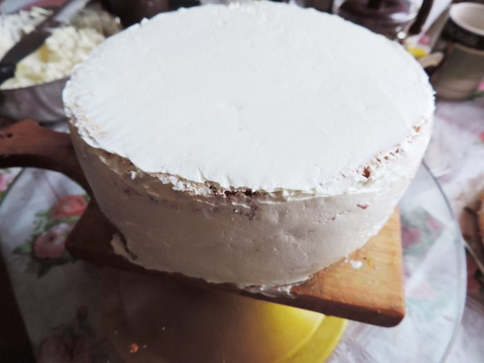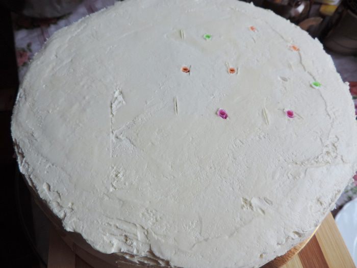 Для ускорения работы торт покрывала белково-масляным кремом, так как мне было некогда тратить время на выравния торта "картофельной" массой.