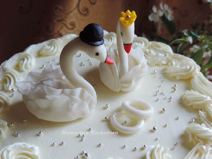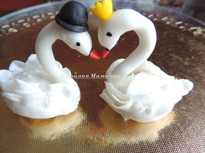 Самым ювелирным этапом для меня стал процесс работы над украшениями. Если розы лепить мне уже приходилось, то с лебедями столкнулась впервые. Клювики им раскрашивала, в прямом смысле слова, затаив дыхание, - так страшно было, что рука дрогнет - и вся работа на смарку.