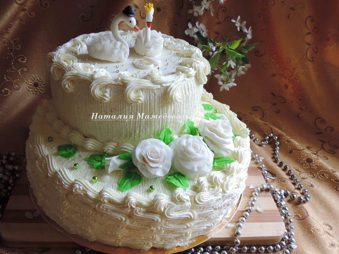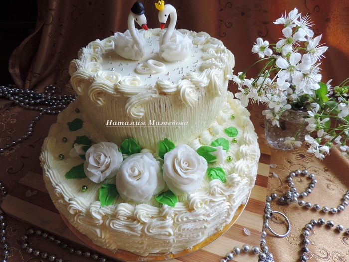 Торт пекла на свадьбу сына подруги. Хотелось его сделать красивым, нежным и узнаваемо-свадебным