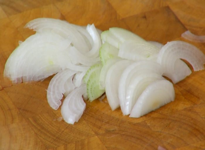 Лук почистить и нарезать тонкими полукольцами.