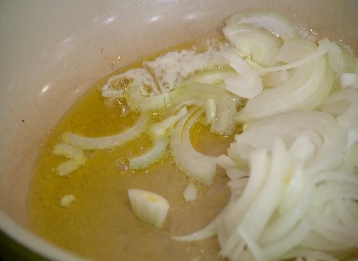 Разогреть в сковороде оливковое и сливочное масло, посолить его и выложить лук.