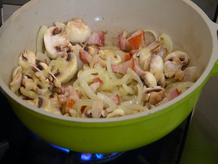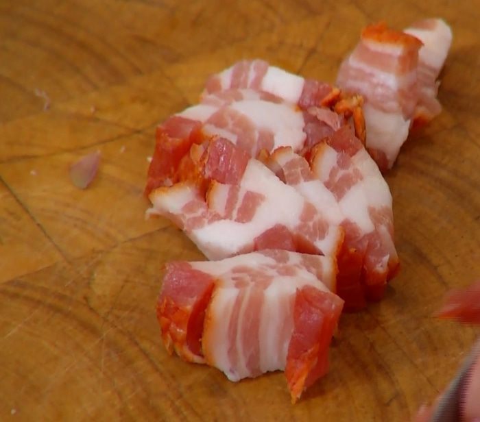 Грудинку нарезать небольшими полосками и отправить в сковороду с луком.
